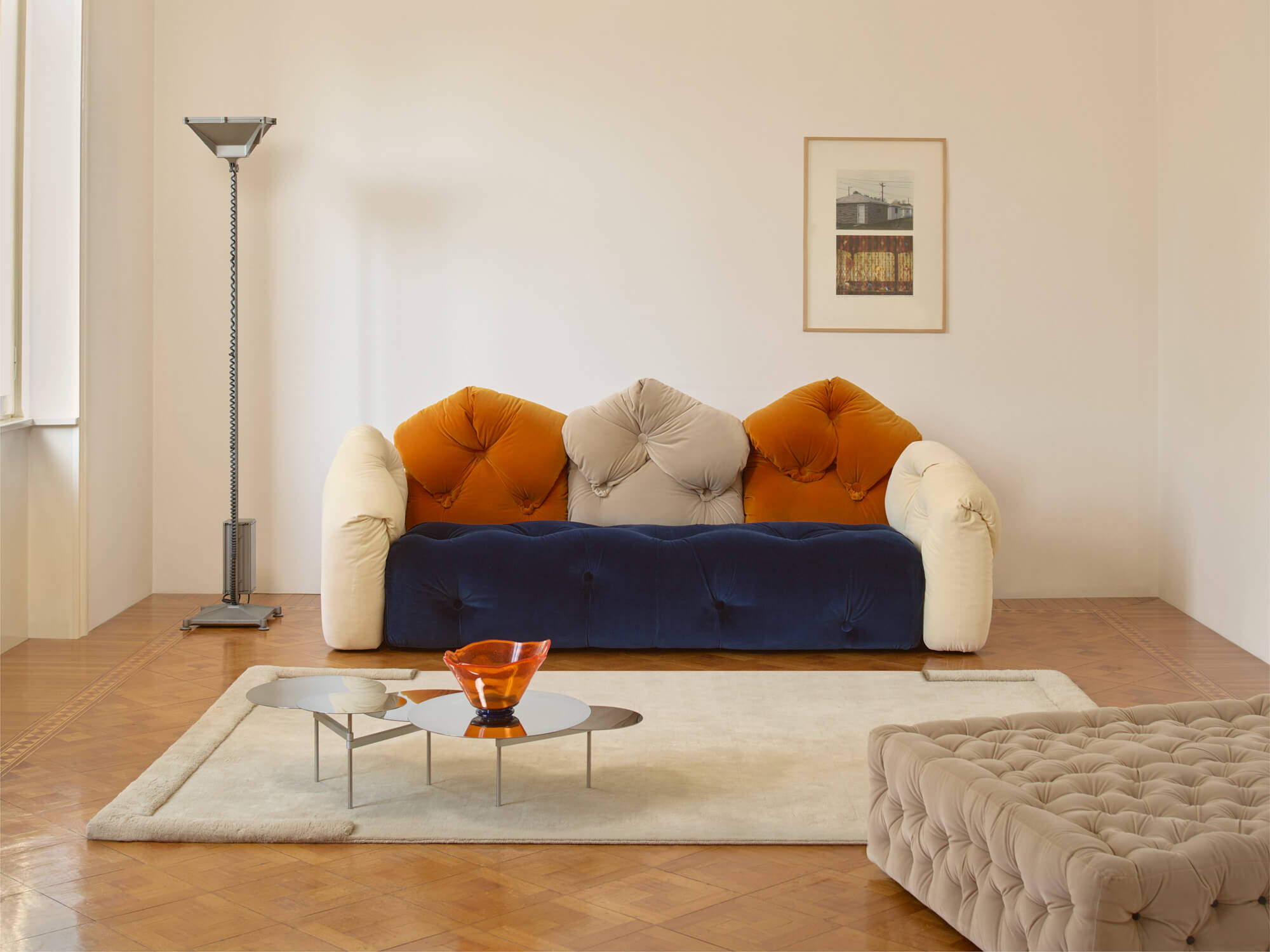 Il Sofà Michetta ridefinisce il salotto borghese sovvertendo lo stile tradizionale della lavorazione capitonné, la cui simmetria è distorta in forme inaspettate, che ora lievitano ora si sgonfiano. La manifattura impasta forme di morbido poliuretano per offrire comfort e supporto nella seduta; i bottoni segnano punteggiano la superficie e evidenziano l’asimmetria del design, che fa dell'irregolarità il suo carattere più evidente.