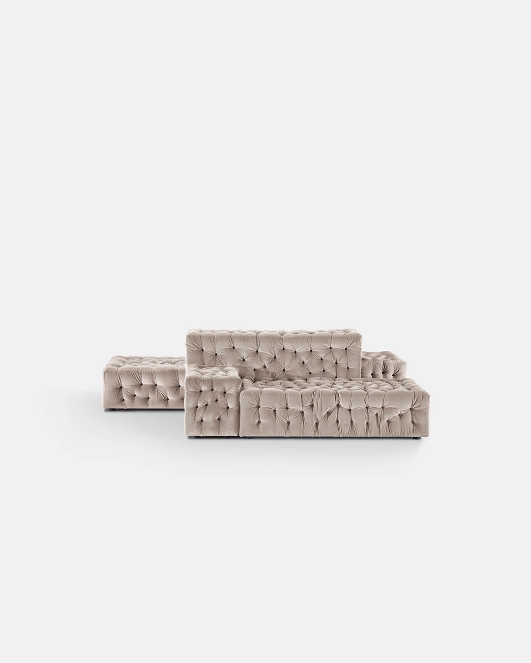 La lavorazione capitonnè lievita in maniera randomica, ora flettendo ora crescendo, in contrasto con la geometria di ogni modulo rettangolare o cubico, delimitato dalla struttura in legno. I bottoni segnano gli avvallamenti della superficie e la punteggiano, tratteggiando un motivo tridimensionale e irregolare che invita a esplorare la comodità della seduta. La Michetta è per sedersi, per distendersi; anzi, sedersi e distendersi diventano azioni da riconsiderare, a seconda che il modulo sia orizzontale, verticale, seduta o schienale o bracciolo, singolo o multiplo. È un divano accogliente, icona di un comfort condiviso: una comodità che invita alla convivialità.